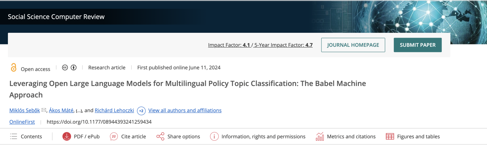 On June 11, 2024, a new article has been published by Miklós Sebők, Ákos Máté, Orsolya Ring, Viktor Kovács and Richárd Lehoczki in the Social Science Computer Review. The title of the article is “Leveraging Open Large Language Models for Multilingual Policy Topic Classification: The Babel Machine Approach.”