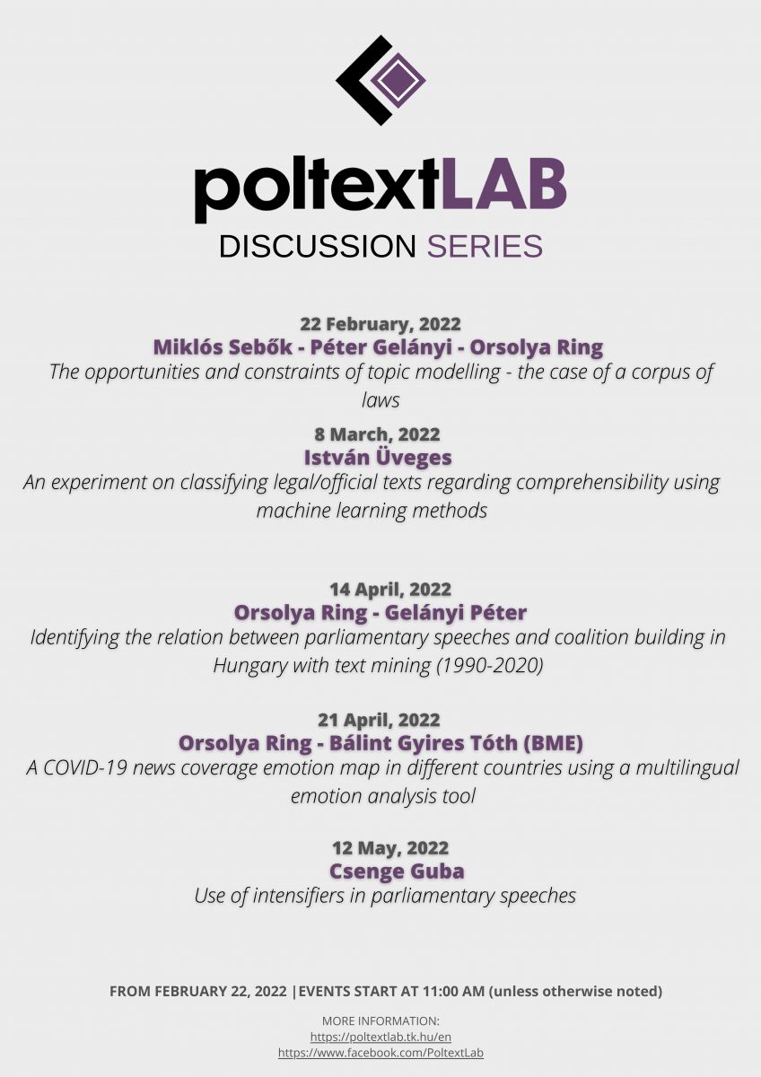 2021. december 16-án indítottuk el kutatócsoportunk kéziratvitáit, amely idén is folytatódik. Mindenkit szeretettel látunk, akit érdekel a szövegbányászat és a mesterséges intelligencia!